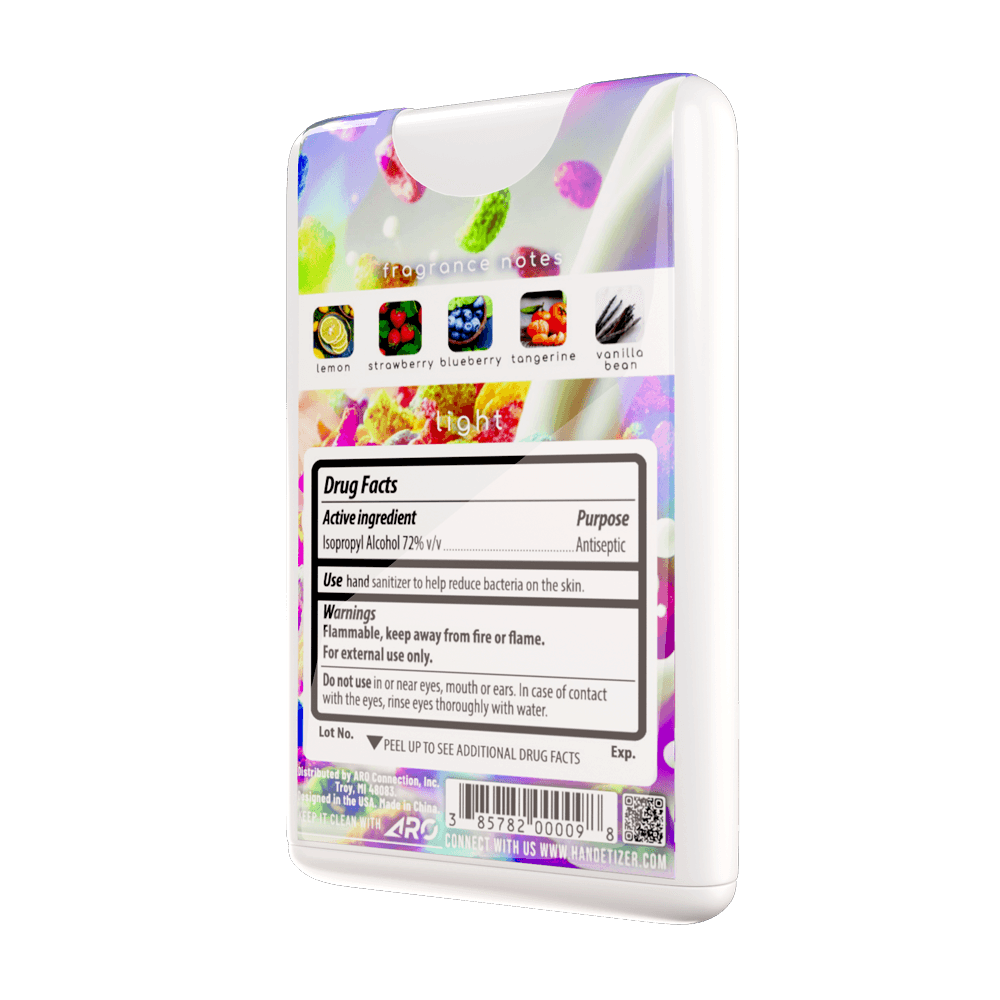 Fun and fruity. Fruit-O-Pebbles hand sanitizer rocks like breakfast fun—a blend of bright citrus and juicy berries with a milky vanilla bean finish. It’s youthful, nostalgic, and bubbly, like milk splashing in bowl of your favorite fruit cereal. The fine mist feels playful and invigorating, leaving a deliciously sweet, fruity trail.
